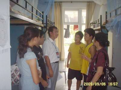 9月6日下午,胡鸿主任、刘华副主任在人文与管理系团总支书记吴映辉老师和09级辅导员卞呈祥老师、张业睿老师的陪同下前往各宿舍看望09级新生,亲切询问员工住宿、生活情况,与陪送家长进行热情交谈。系领导特别提醒他们在现今甲型H1N1流感爆发的非常时期,一定要注意宿舍卫生和个人健康状况。特别强调了宿舍安全问题,在开学之初,公寓楼人员来往复杂,对推销等人员一定要加以提防,以防止被欺骗。系领导叮嘱09级辅导员,一定要加强对新生的关注度。
