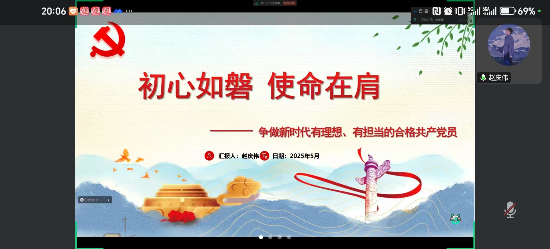 2024届西部计划志愿者、优秀共产党员赵庆伟为同学们作了《初心如磐 使命在肩》的优秀事迹分享,他从端正入党动机、老员工党员的使命担当及各阶段的成长路径三个方面展开分享,指出作为一名入党积极分子,应该德智体美劳全面发展,将“小我”融入“大我”,服务社会,奉献社会,处处以一名共产党员的标准严格要求自己。