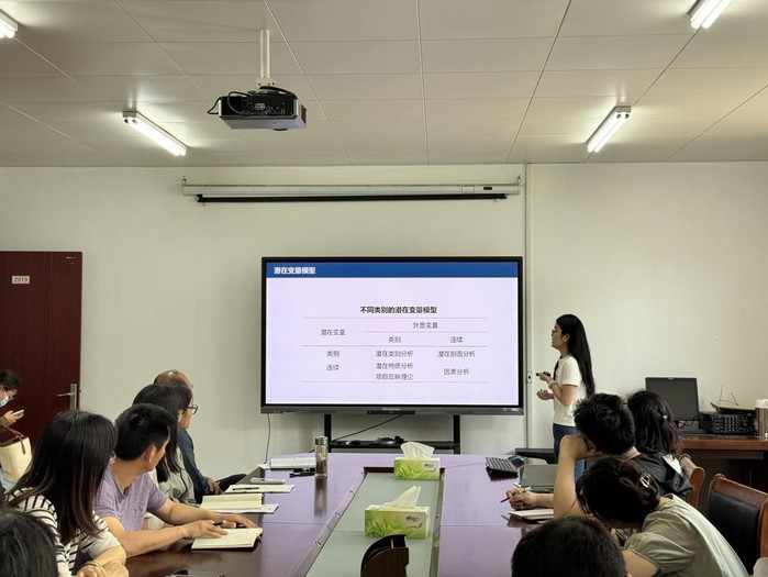 崔春影博士以潜在类别模型的介绍与应用为题作学术报告,重点介绍潜在类别模型的分析原理、模型选择、模型解读和操作实现过程;并结合自身研究的课题解析了乳腺癌患者社会约束的潜在剖面类别及其影响因素。现场氛围活跃,互动积极,崔春影博士还积极与师生们开展相关讨论和答疑。