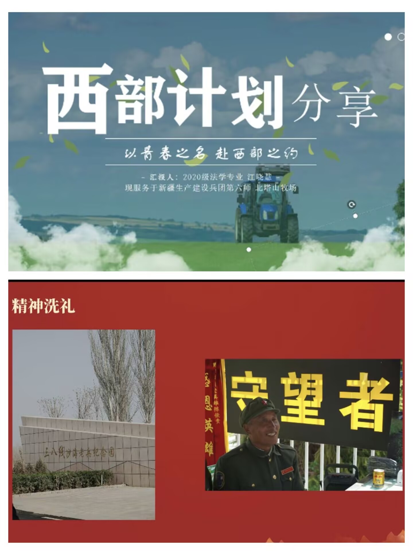 四位嘉宾均奔赴新疆各地开展志愿服务与工作,结合各自经历带来了内容翔实、各有侧重的分享。2024届医疗保险专业陈嘉芸分享了自己参与西部计划的心路历程,以亲身经历鼓励学子勇敢逐梦;法学专业江晓慧系统梳理了西部计划报名全流程,详细解读政策支持体系,并分享了岗前培训与基层适应的真切感悟;法学专业赵庆伟重点解析了选拔环节中笔试与面试的考察要点,介绍了岗位分配流程,并结合参观感悟与先进事迹,传递了西部计划的精神价值;2025届法学专业董家丹则聚焦西部计划中可能遇到的挫折与困难,对比分析了各服务地区的差异,提醒学子提前规划、慎重选择。
