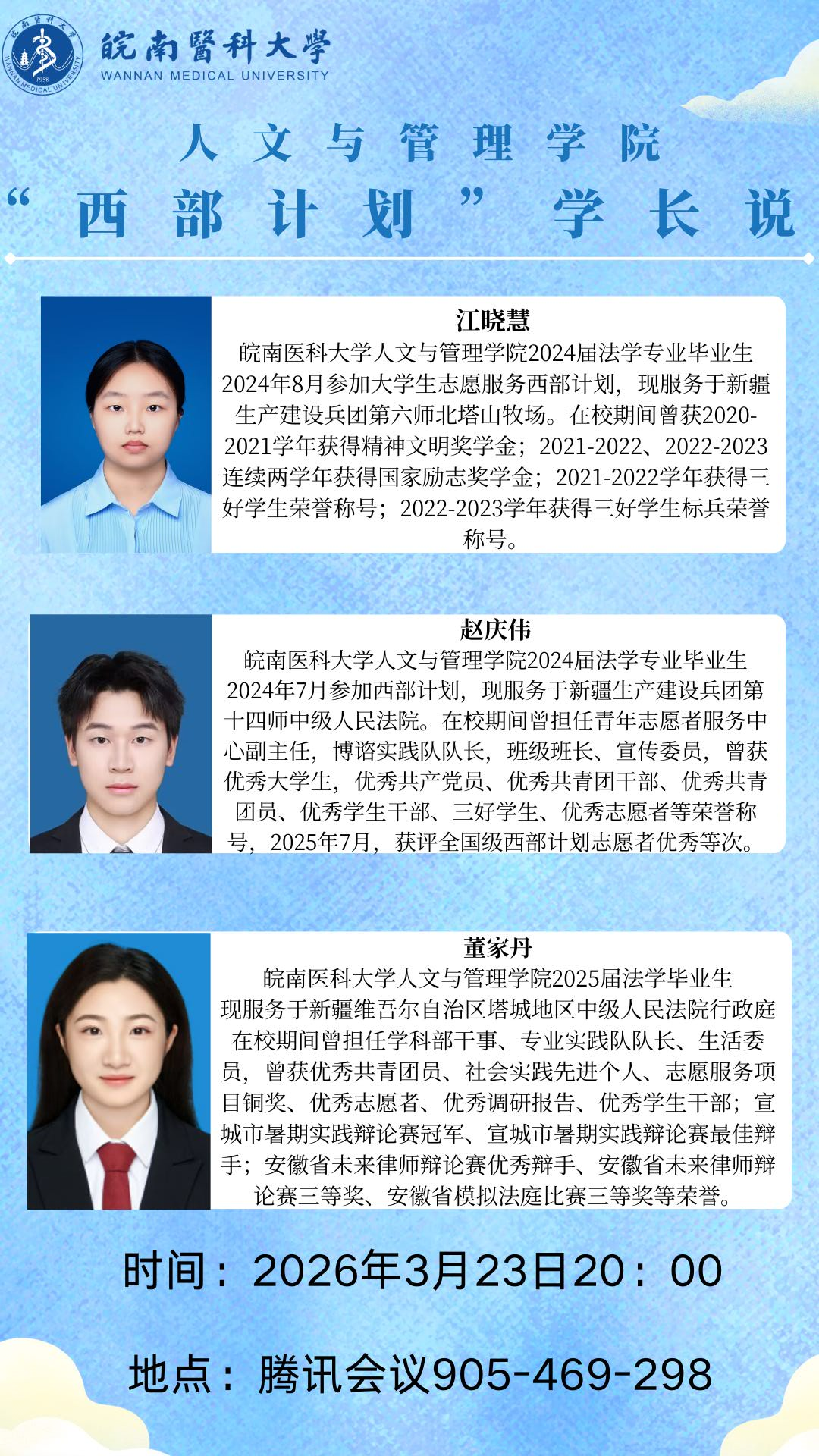 为深入宣传老员工志愿服务西部计划,引导青年学子将个人理想融入国家发展大局,3月23日,bevictor伟德国际通过腾讯会议举办“西部计划”学长说线上分享会,邀请四位投身西部建设的优秀毕业生担任嘉宾,分享基层服务经历与成长感悟。