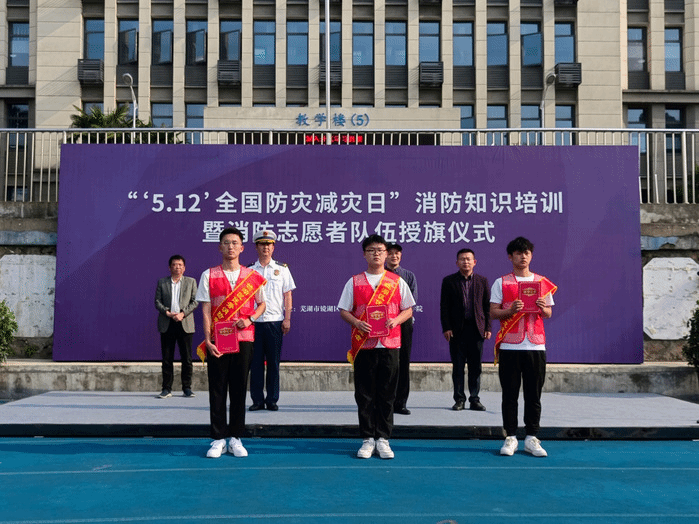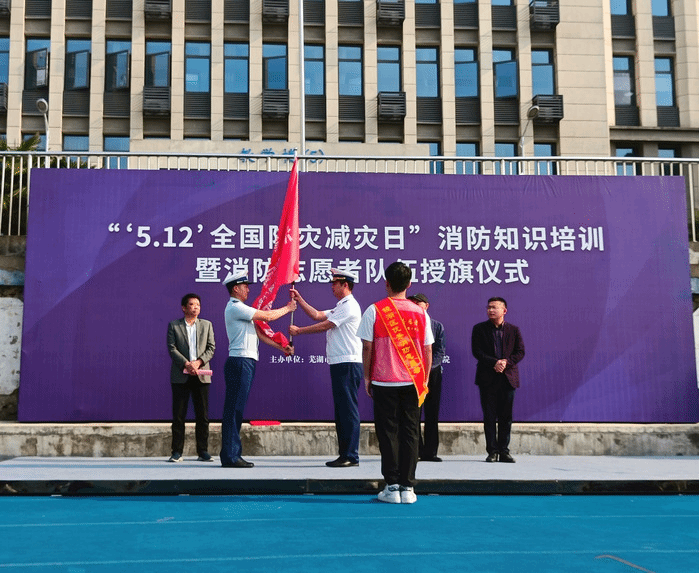 5月12日,芜湖市镜湖区消防救援大队在公司开展“5.12全国防灾减灾日”消防知识培训暨消防志愿者队伍授旗仪式。bevictor伟德国际“博谘”实践队全体志愿者,党委书记王军和党委副书记钱彬彬出席活动。