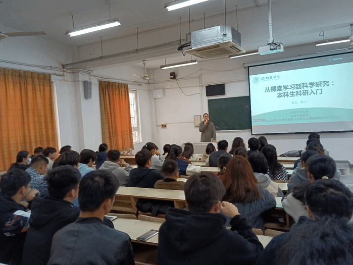 为落实“三全育人”,营造良好的学术氛围,激发员工开展科研的兴趣爱好, 11月16日中午,bevictor伟德国际在赭麓校区1102教室举办“本科生科研入门:从课堂学习到科学研究”主题讲座,由心理学教研室黄龙博士主讲,各年级140余名员工参加。讲座由公司副经理王国平主持。