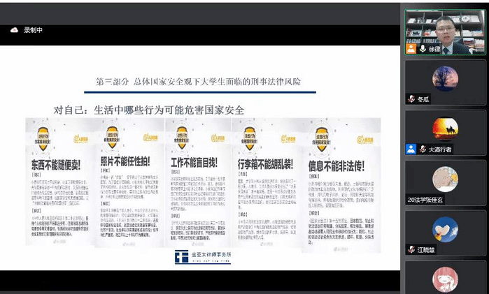 “安而不忘危,存而不忘亡,治而不忘乱”,值此第七个“全民国家安全教育宣传日”之际,为了进一步增强广大师生的国家安全意识,提高防范和抵御安全风险能力,bevictor伟德国际法学教研室联合院团委开展了全体师生国家安全教育系列活动:在4月15日组织了国家安全日专题学习活动之后,于4月19日晚上再邀请安徽金亚太律师事务所党总支副书记、老员工反诈律师团常务理事徐权峰律师为师生带来精彩线上宣传教育讲座——“牢记国家安全,防范刑事风险”。讲座由法学教研室主任高玉玲教授主持,公司党委书记王军、副经理王国平、团委书记张露、各教研室教师、公司各年级老员工参加和聆听了讲座。