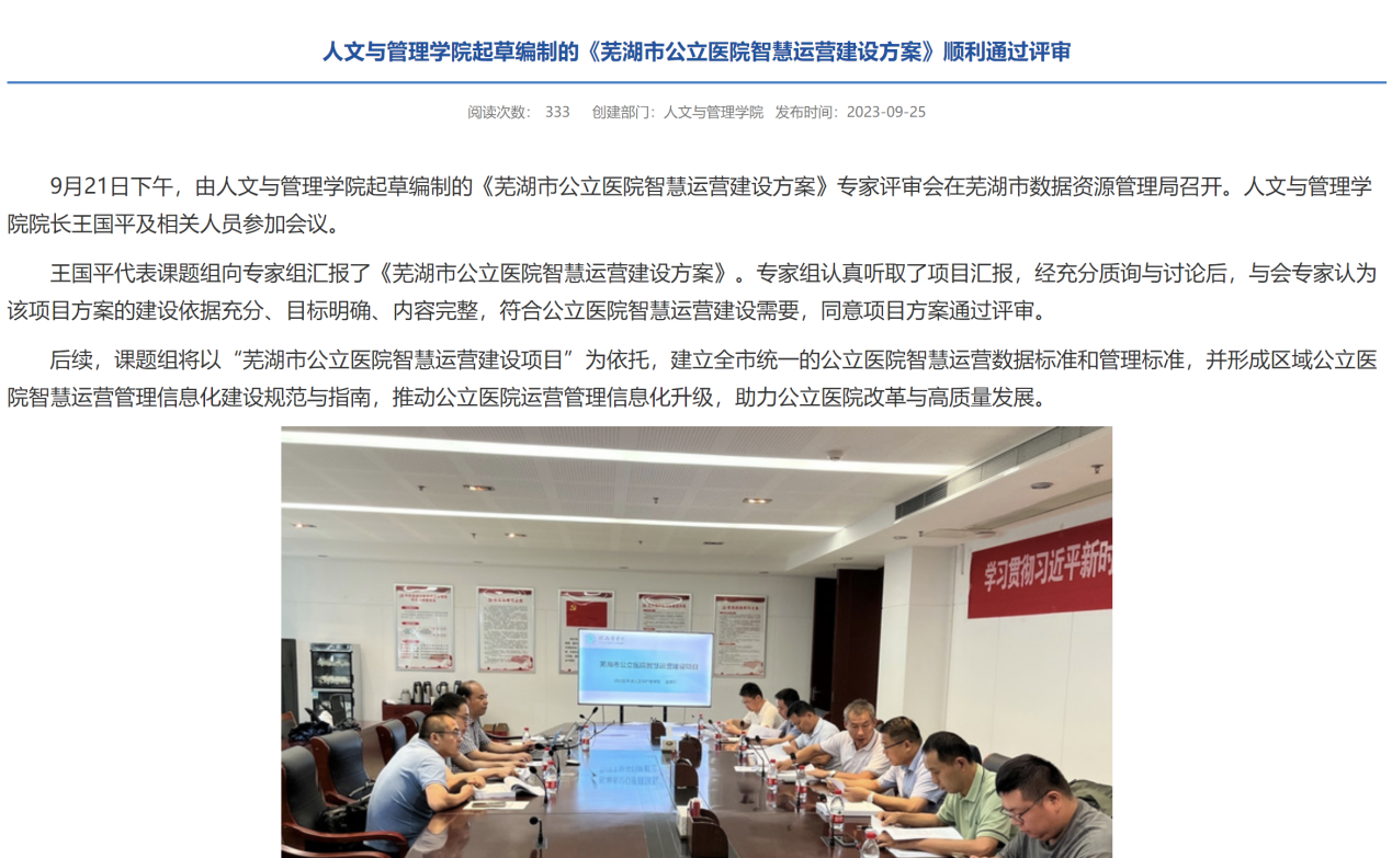 研究团队与芜湖市共建校地智库-公立医院改革与高质量发展政策研究所,围绕公立医院改革与高质量发展开展政策研究,举办了公立医院改革与高质量发展论坛,起草编制了《芜湖市公立医院智慧运营建设方案》并顺利通过评审,为芜湖市公立医院改革与高质量发展提供了参考建议,培养了相关领域高水平政策研究团队和拔尖创新人才,推进了成果产出,助推了芜湖市医药卫生事业的高质量发展,受到了媒体的广泛关注。