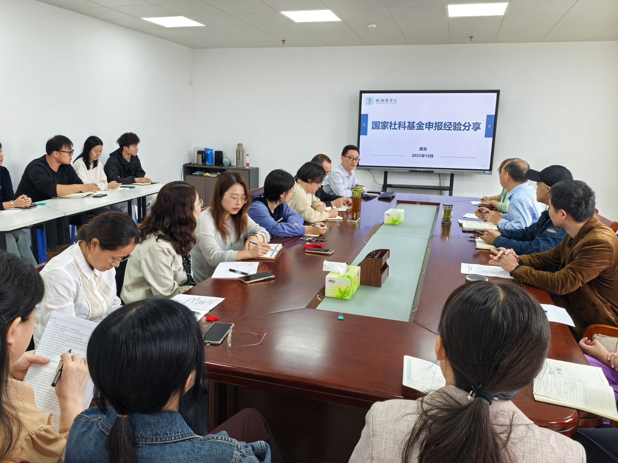 会议邀请到科研经验丰富的黄龙博士,为大家带来国家级科研项目申报的深度经验分享。黄龙博士结合自身申报国家自然科学基金、社科基金项目的难忘历程,针对选题凝练、文献综述、研究内容设计、创新之处阐述、研究方案制定等申报核心环节,进行了细致入微、毫无保留的讲解。他着重强调,“选题”堪称申报成功的“灵魂”所在,一个优秀的选题既要紧跟学术前沿,又要紧密贴合国家战略需求。此外,黄龙博士还就申报书中容易被人忽视的细节问题,给出了诸多切实可行、操作性强的建议。整场报告内容丰富详实,满满都是“干货”,令与会教师收获颇丰,纷纷表示对完善自身申报书具有极高的指导价值。
