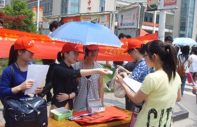 活动中,同学们不畏烈日,向广大教职工和员工积极宣传健康知识,发放《食品安全法》等知识传单,还向过往的老师和同学免费发放爱心风油精,现场气氛温馨热烈。