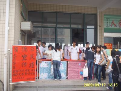 9月20日是第一个公民道德宣传日。“关爱、文明、表率”是今年道德宣传日的主题。为使同学们更加直接清楚地了解如何做一名有道德的公民,法学(1)班的同学们手工制作了一些宣传展板,以漫画的形式向周围的同学介绍了一些常识,并对同学们提出的相关问题一一作出解答,深得同学和老师的赞许。活动现场分工有序、气氛高涨,同学和老师纷纷前来签名以表示对本次活动的支持。此外,9月17日,人文与管理系法学(1)班在班长陶军军的带领下在公司食堂门口开展了一次公民道德宣传活动。系团总支书记吴映辉老师也到场作了指导。