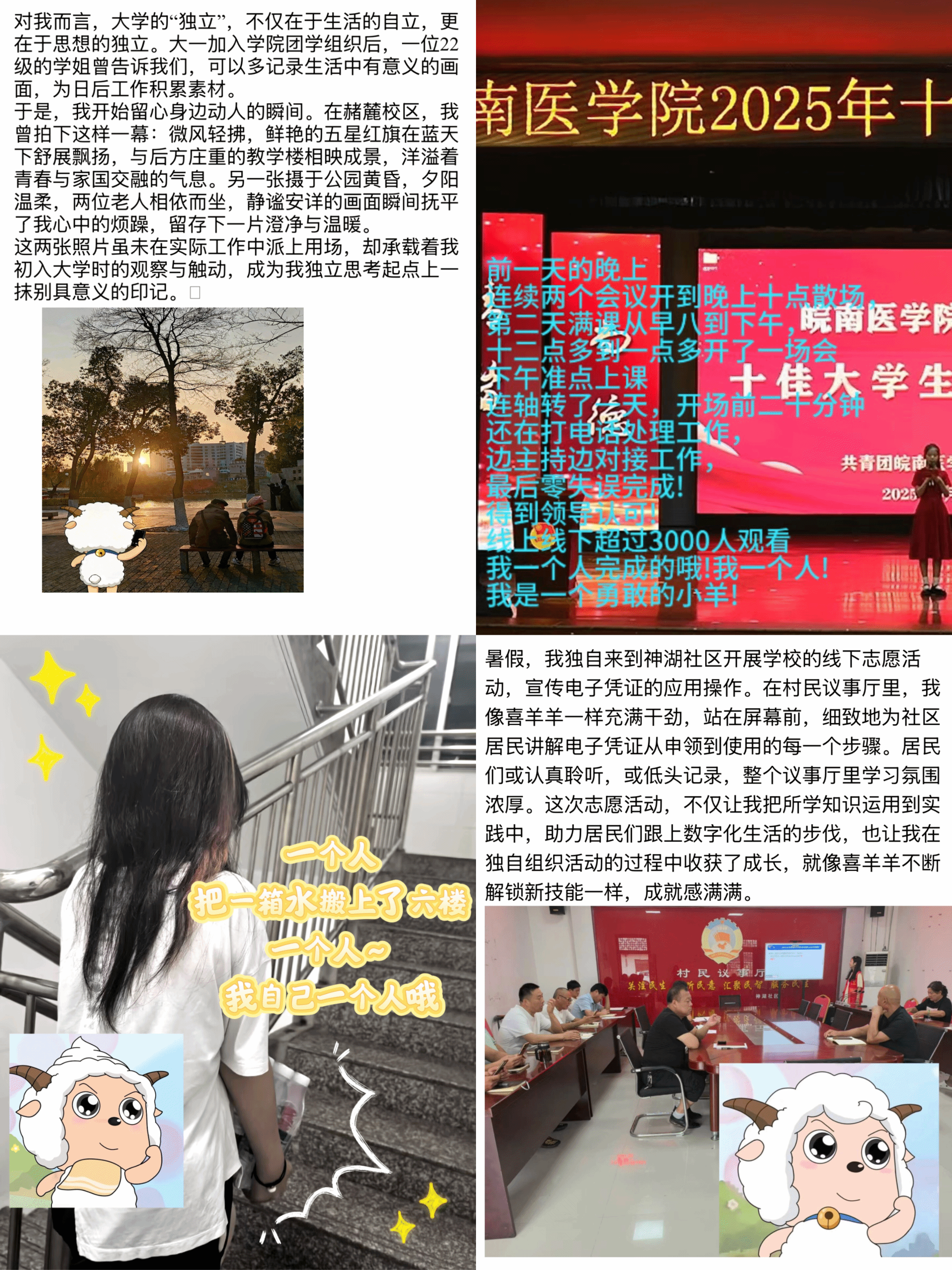为了鼓励员工记录和分享大学期间从依赖走向独立的成长历程,bevictor伟德国际于9月26日至10月2日面向全院员工开展“小羊成长记·我的独立图鉴”图文征集活动,活动旨在记录同学们离开家乡、开启老员工活后的成长历程,包括独立适应校园生活、独自就医、参与志愿服务、投身科技项目等多方面经历。这些点点滴滴的成长印记,如同一只只小羊离开母羊庇护、逐渐独立的过程,展现了当代老员工在陌生环境中勇敢前行的精神风貌。